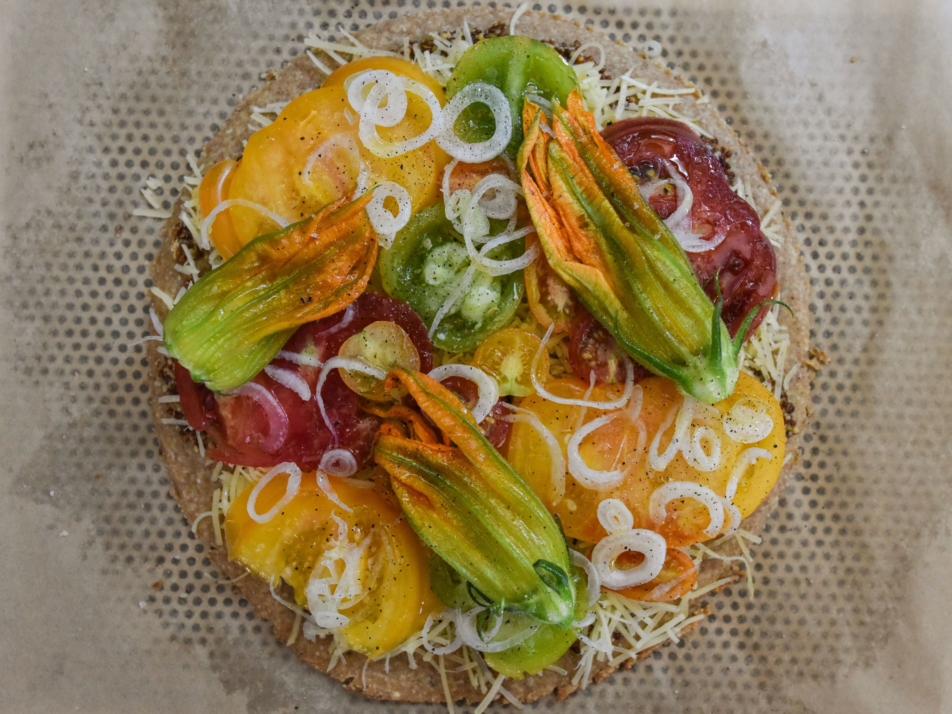 Trancher les tomates et petites tomates et les disposer sur la couche de comté en une seule couche.