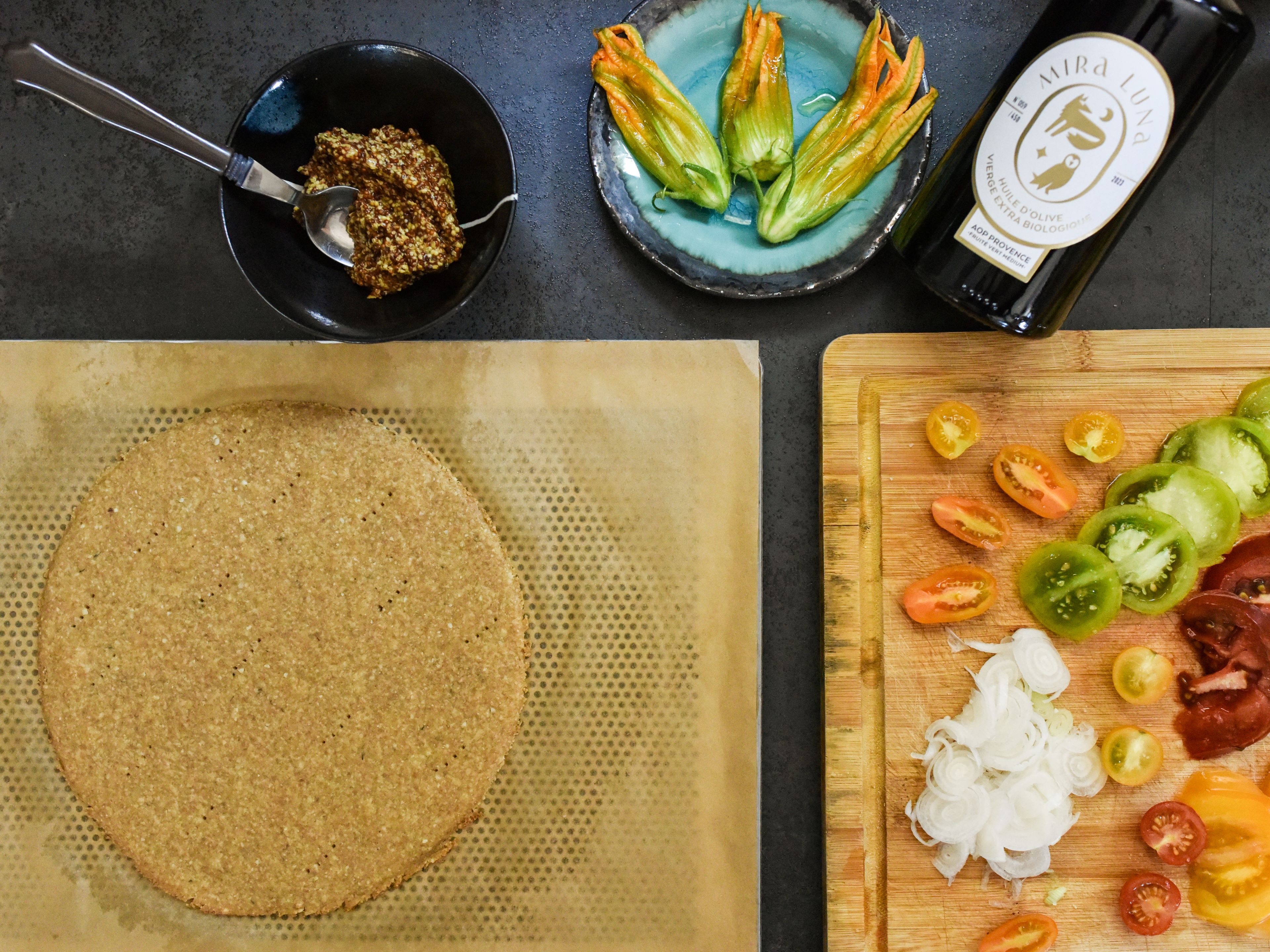 Mélanger 150 g de farine de petit épeautre, 50 g de poudre d’amande moulue fraîchement, 5 cl d’huile d’olive AOP Provence, 5 cl d’eau, 1 cuillère à café de sel aux herbes pour obtenir une pâte homogène.