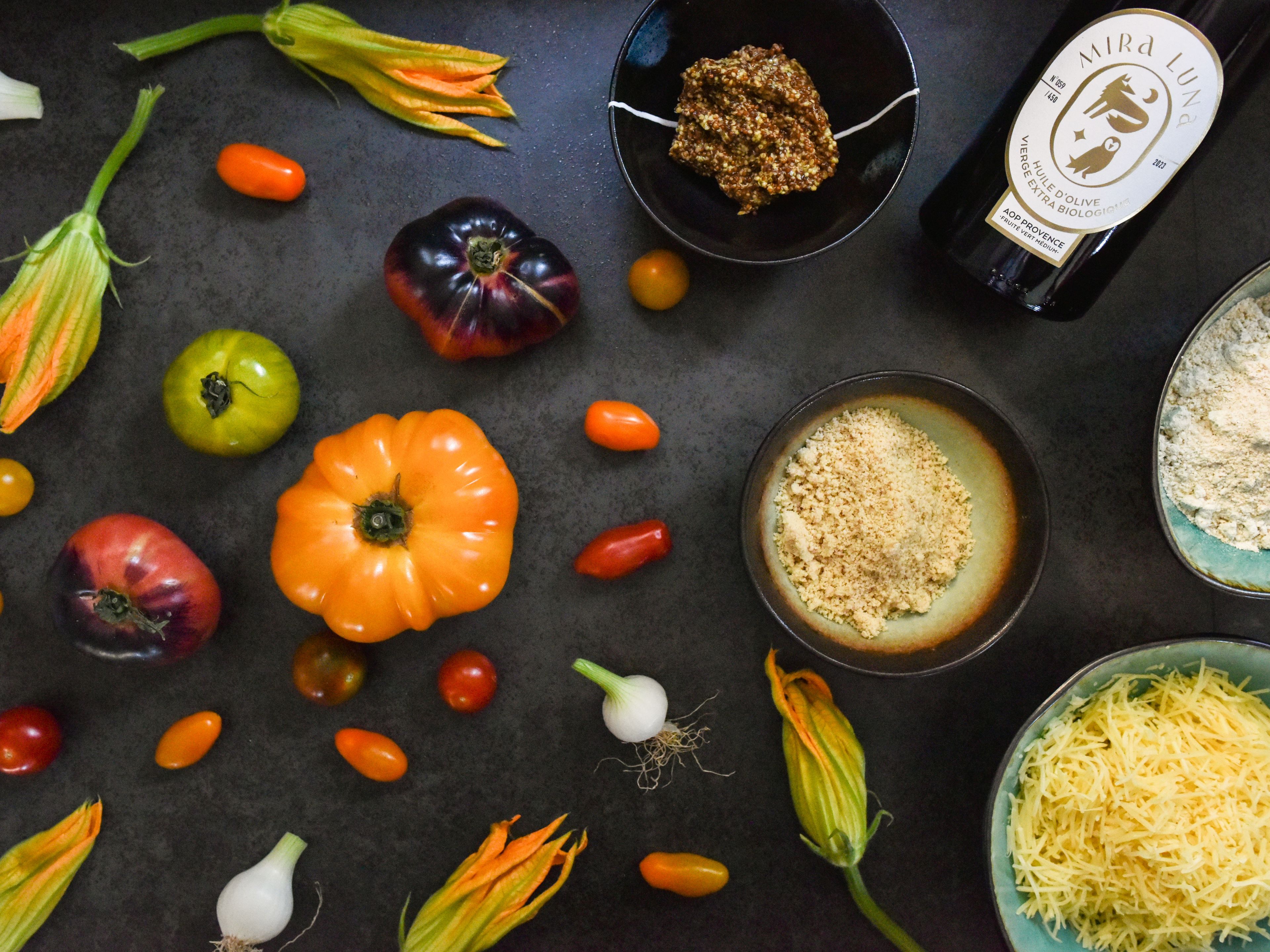 Passer les fleurs de courgettes dans l’huile d’olive et les disposer joliment sur la tarte.