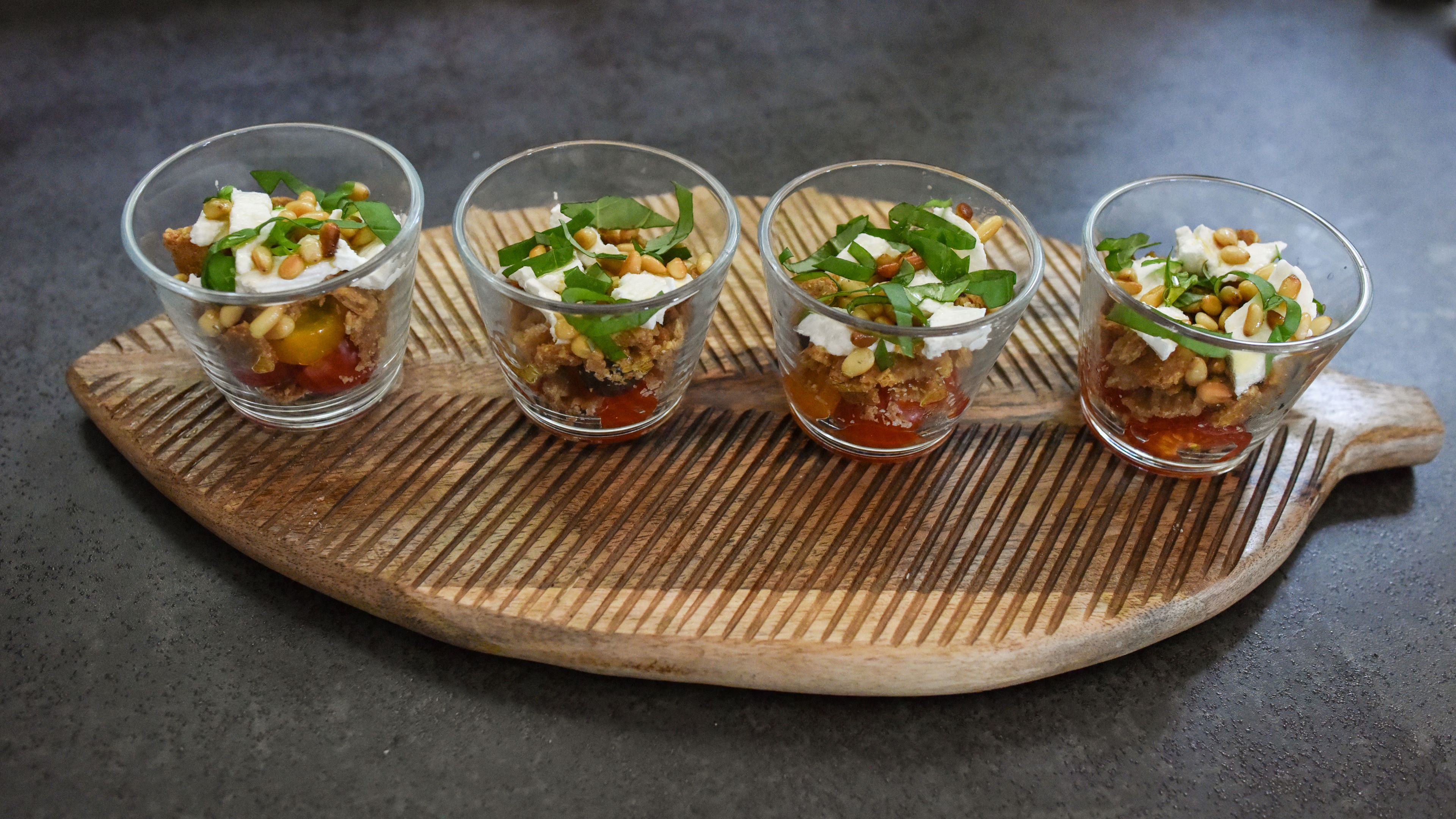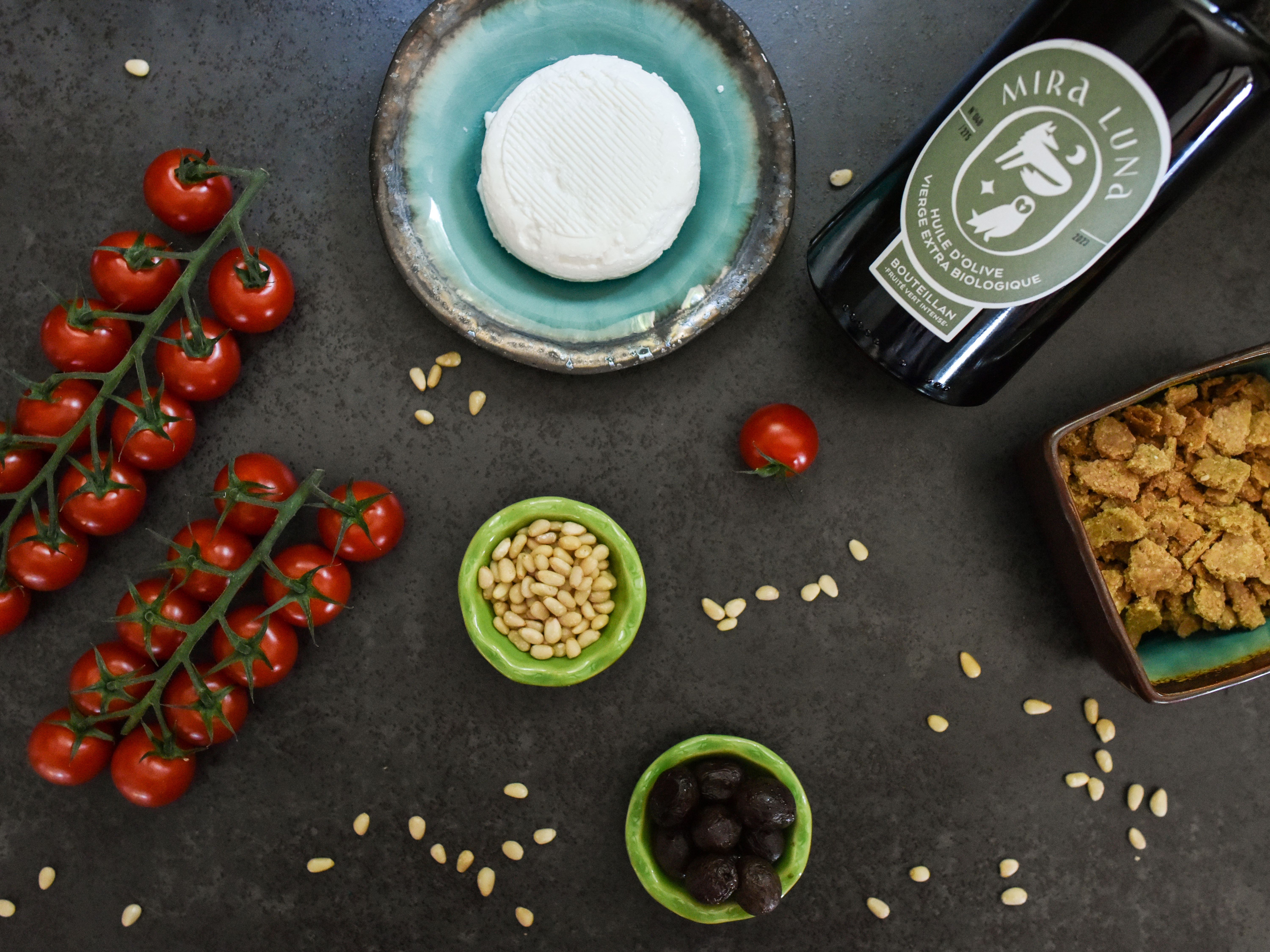 Méli-mélo de tomates cerises confites, chèvre, olives noires, crumble de petit épeautre et pignons de pin